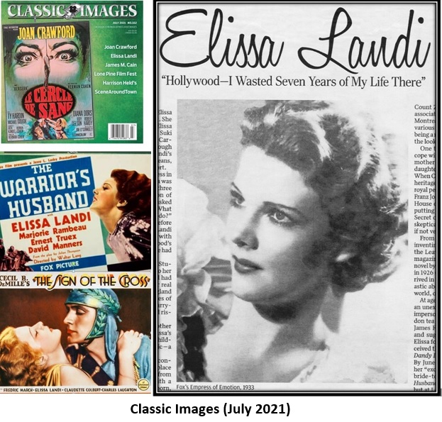 Cecil B. DeMille boosted Landi's visibilty, co-starring her with Fredric March in the cinema classic The Sign of the Cross (1932). The ciritcal success of Landi and Robert Donat in The Count of Monte Cristo (1934) also proved to be a box-office success. Elissa made an entrancing vis-a-vis for other leading men: Laurence Oliver, Ronald Colman, Cary Grant, Warner Baxter and Doug Fairbanks Jr.